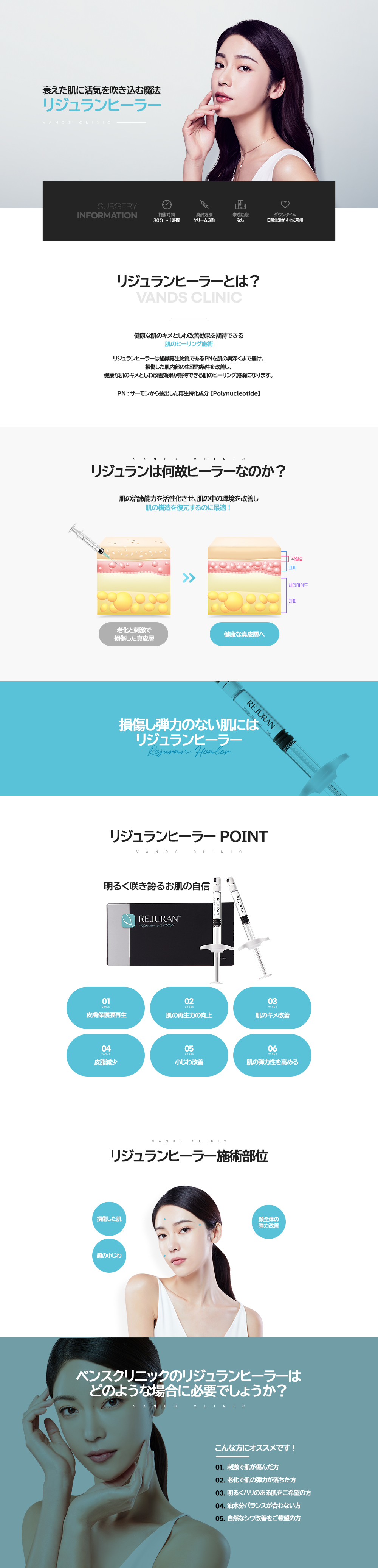 リジュランヒーラーは、生体適合物質であるポリヌクレオチド(PN、polynucleotide)という成長因子複合体です。単純に表皮層に水分を供給するマスクパックとは異なり、薄くたるんだ肌の表皮層と真皮層の根本的な再生を働きかけ, 健康的でハリのある肌へと導く施術です。